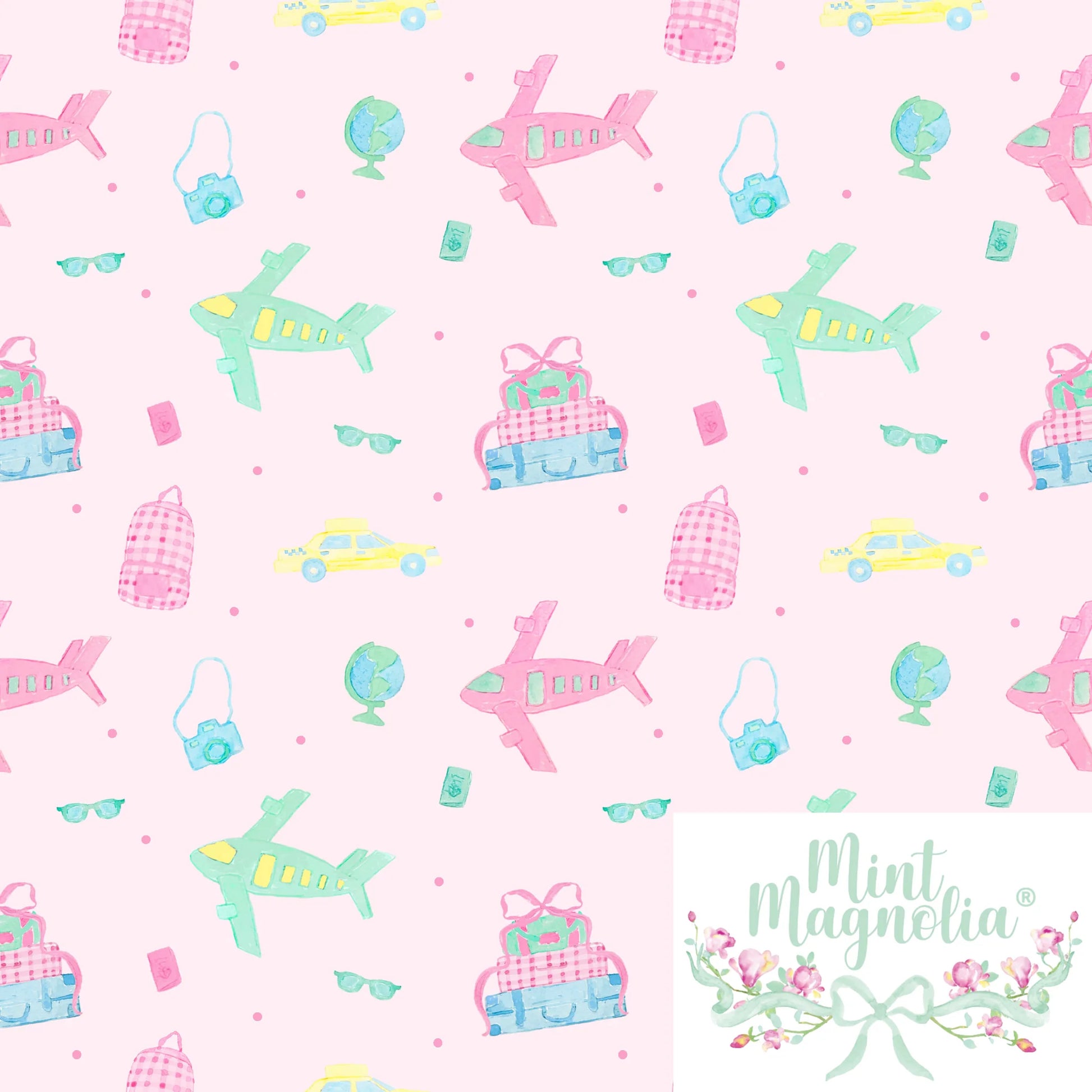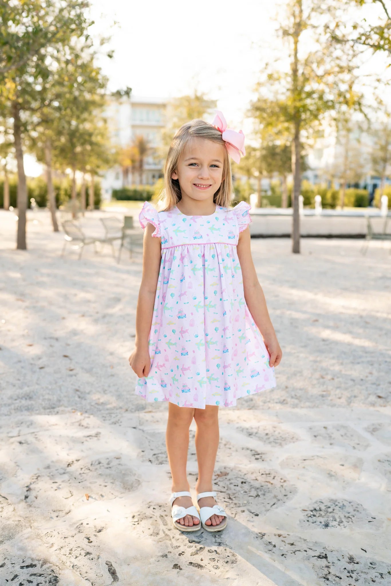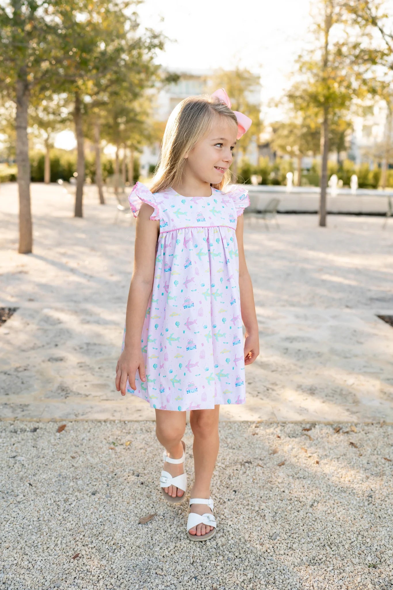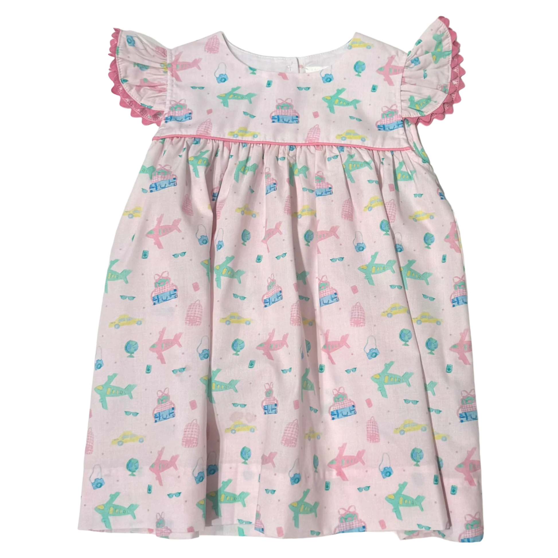 Our Betsy Dress features a high yoke, swingy skirt and angel wing sleeves. Betsy is pictured here in our custom, Adventure Awaits travel-themed print with hot pink piping across the yoke and hot pink ric rac trimming the sleeves. Inspired by our love of travel and exploring the world with our children, our custom Adventure Awaits print will have her perfectly dressed for all of your travel adventures ahead.