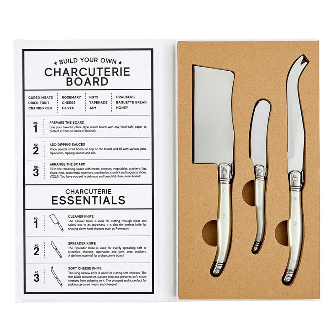 The perfect gift for a hostess! These pearl handled charcuterie knives come in a stylish cardboard book box.