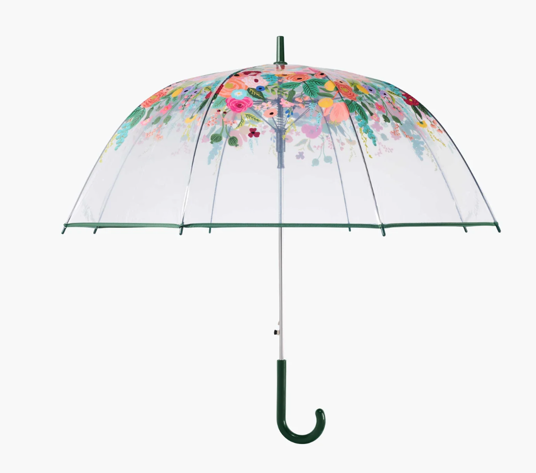 Our clear Garden Party Umbrella will brighten any rainy day. The umbrella features a transparent canopy, a green hooked handle, and an auto open/close function.