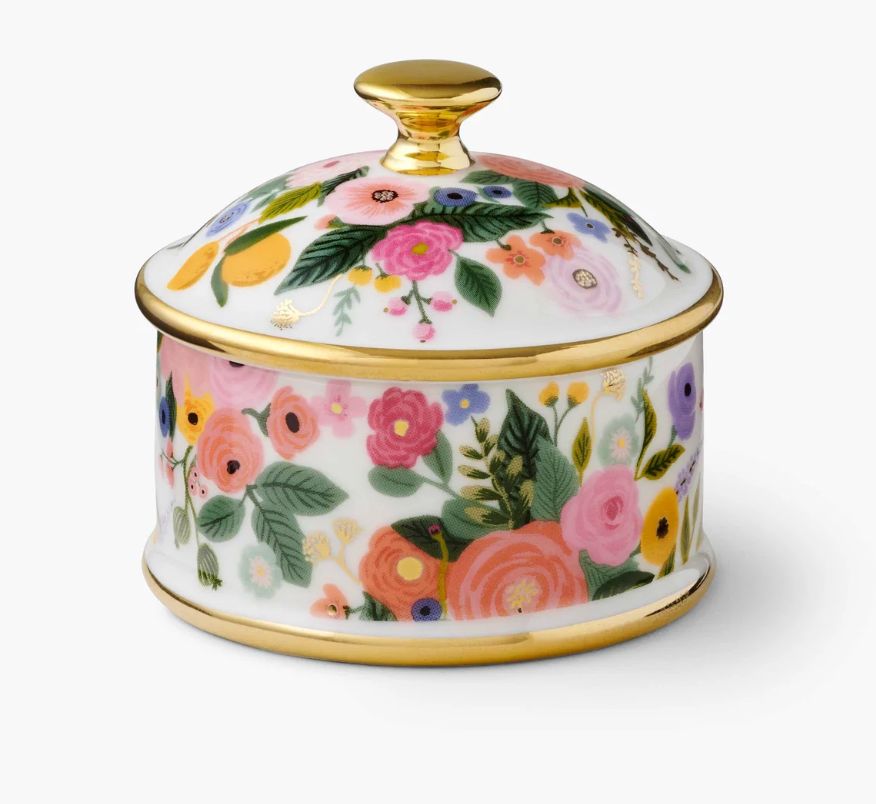 Store all your tiny treasures in this porcelain lidded box, perfectly sized for change or jewelry. The box features our signature Garden Party florals with gilded edges and handle for extra shine.