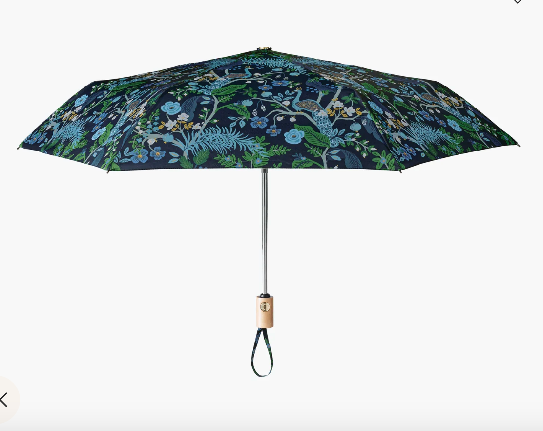 No rainy day blues here. Our Peacock umbrella features a wooden handle, a patterned sleeve, and an auto open/close function.