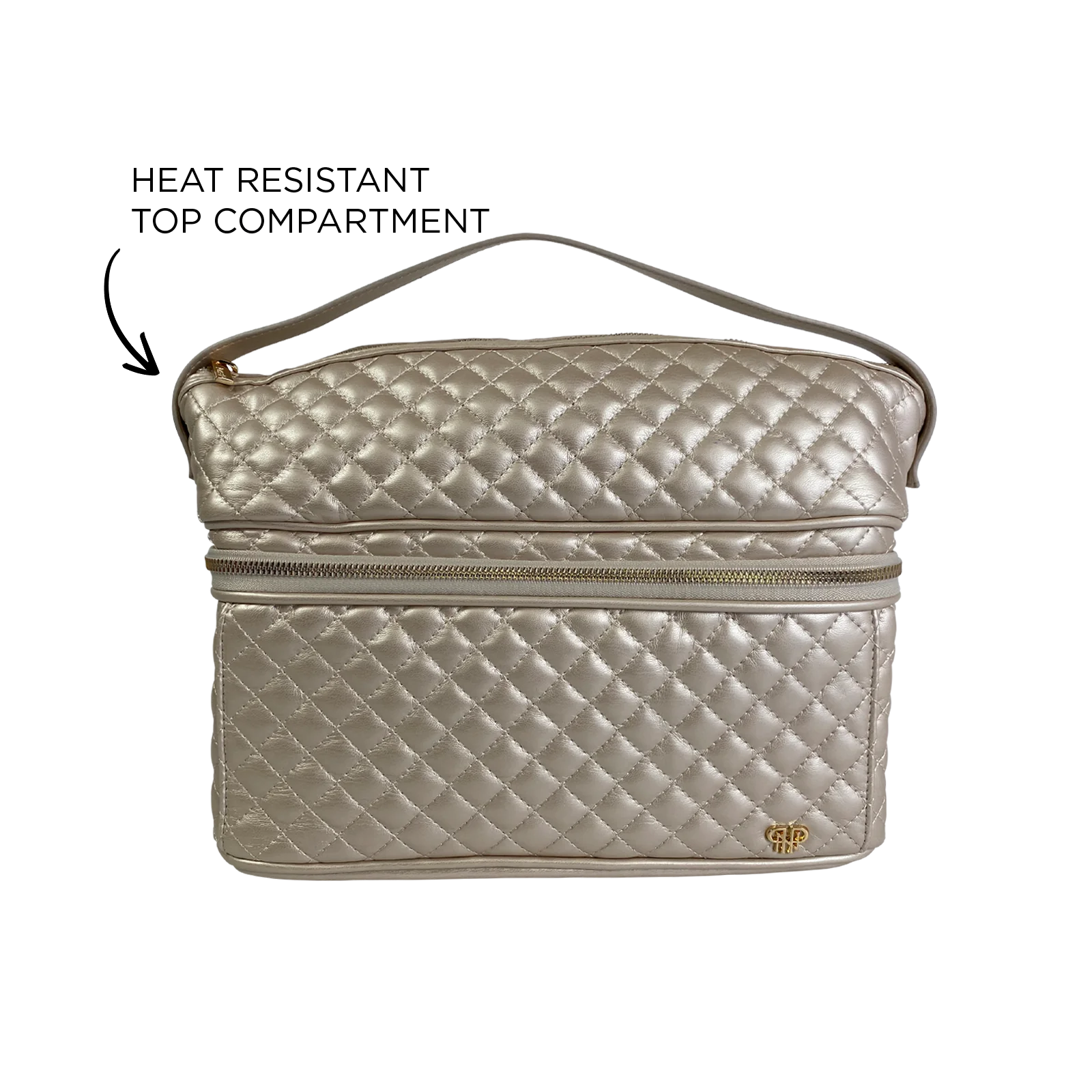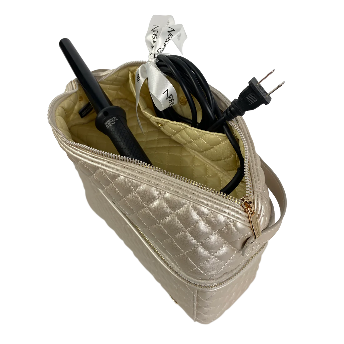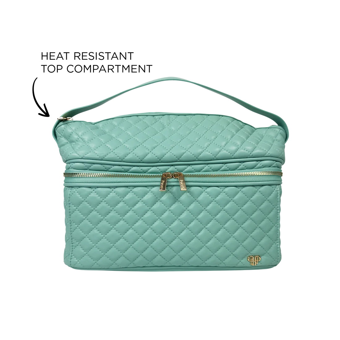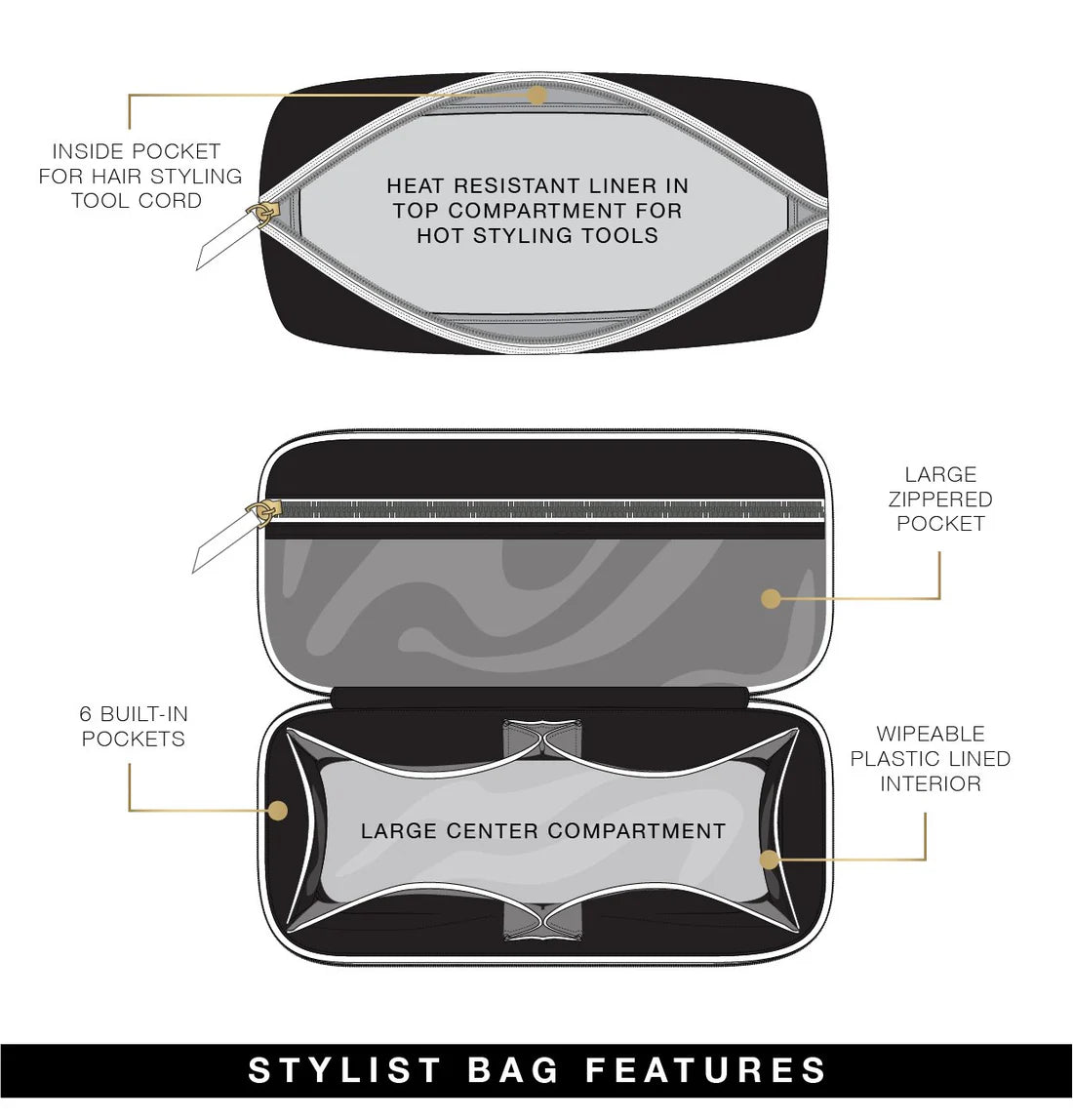 The Stylist Bag is designed for hot styling tools and keeping them separate from your other beauty products. The top compartment features a heat resistant liner so you don’t have to wait to put away your hot tools. The bottom compartment is ideal for larger and heavier items such as bottles, jars, hairbrushes and more. The two combine to make the ultimate toiletry case.